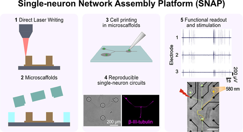 Bisher beruhen in-vitro-Modelle des Gehirns häufig auf zufällig entstehenden Zellverbindungen, was ihre Reproduzierbarkeit stark einschränkt. Das SNAP-Verfahren hingegen kombiniert 3D-gedruckte mikrofluidische Kanäle mit modernster Laser- und Softlithografietechnologie. Die einzelnen Zellen werden dabei mit mikroskopischer Präzision mithilfe einer Mikropipette und eines Mikromanipulators in den Kanälen positioniert. Auch das Axonwachstum der Nervenzellen lässt sich gezielt steuern, sodass klar definierte und reproduzierbare neuronale Netzwerke entstehen. So lassen sich Neuronen exakt positionieren und elektrische Aktivitäten präzise messen.
