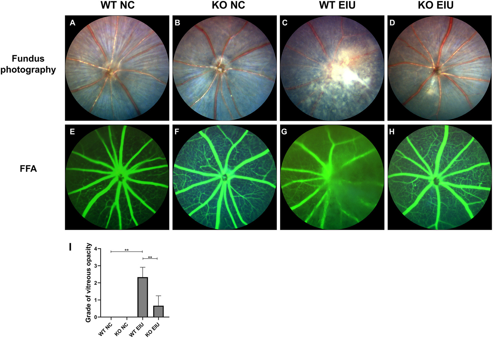 Representative fundus photographs (A–D) and FFA (E–H) of the retinas in the NC and EIU groups. (A) Fundus photograph from the WT NC group. (B) Fundus photograph from the KO NC group. (C) Fundus photograph from the WT EIU group. (D) Fundus photograph from the KO EIU group. (E) FFA from the WT NC group. (F) FFA from the KO NC group. (G) FFA from the WT EIU group. (H) FFA from the KO EIU group. (I) Grade of the severity of vitreous opacity. ∗∗P < 0.01. n = 3 biological replicates per group. FFA, fundus fluorescein angiography; WT, wild type; KO, Cgas knockout; NC, normal control; EIU, endotoxin-induced uveitis.